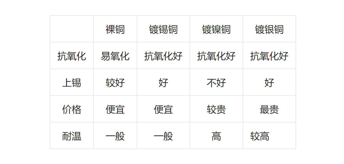 在裸銅,鍍錫銅,鍍鎳銅中價(jià)錢最高,抗氧化好,好上錫,雖耐高溫性能不如鍍鎳銅,但導(dǎo)體使用性能最好(特別是高頻)。